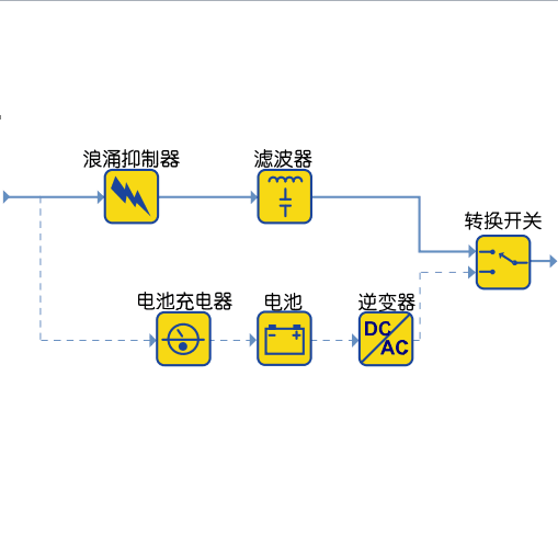 后備式UPS是用于個(gè)人計(jì)算機(jī)的最常見的類型。在圈1所示的結(jié)構(gòu)圖中,轉(zhuǎn)換開關(guān)設(shè)置為選擇濾波后的交流輸入作為主電源(圖中實(shí)線路徑),一旦主電源出現(xiàn)故障,就會(huì)切換到電池/逆變器作為備用電源。一旦發(fā)生這種情況, 轉(zhuǎn)換開關(guān)必須進(jìn)行操作,將負(fù)載切換到電池/逆變器備用電源上(圖中虛線路徑)。逆變器只在電源出現(xiàn)故障時(shí)才啟動(dòng),因此稱作“后備式”。這種設(shè)計(jì)的主要優(yōu)點(diǎn)是效率高、尺寸小和成本低。如果采用適宜的濾波電路和浪涌保護(hù)電路,這些系統(tǒng)還可以提供適當(dāng)?shù)脑肼曔^濾和浪涌抑制功能。