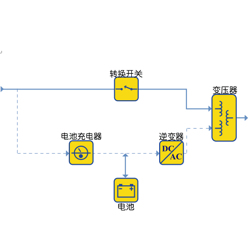 ? ? ? 后備式-鐵磁共振式UPS系統(tǒng)常被視為在線裝置,即使該類設備具有轉換開關,逆變器在后備式模式下工作,并且在交流電源出現(xiàn)故障時表現(xiàn)出了轉換特征。